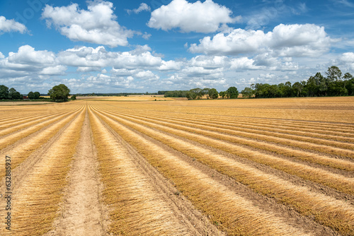 Rouissage d'un champ de lin par une belle journée d'été. Ciel avec nuages