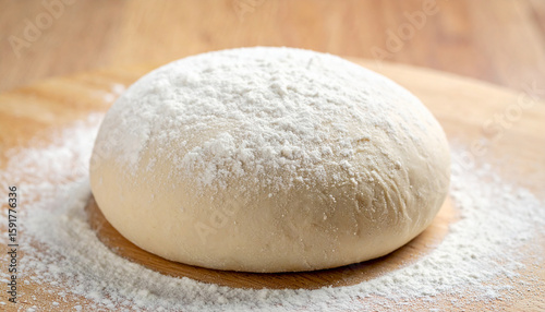 Round dough ball dusted with flour on wooden board. Cooking and baking concept.