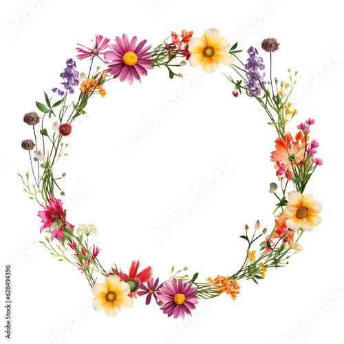 Round frame of flowers isolated on white background with empty space for image. Mockup for design, photo, poster.
