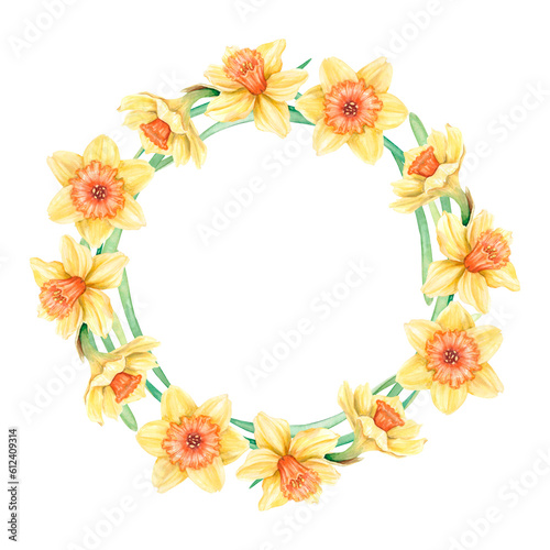 Round frame of yellow daffodils and green stems on white background. Hand-drawn watercolor illustration. Spring bright floral wreath.