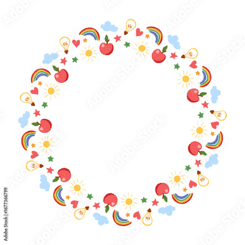 Round frame with childlike doodle drawings of apples, rainbows, suns, stars, light bulbs, hearts and clouds. Vector illustration for school, kids projects, learning and creative design