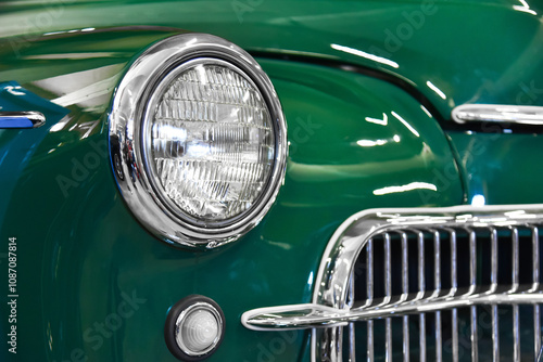 round, headlamp, green, retro, car, fragment, detail, chrome, light, front, radiator, grille, glossy, surface, colours, body, sedan, vintage, antique, vintage car, land vehicle, transportation, old-fashioned, metallic, bumper, part of, metal, front view, elegance, nostalgia, exhibition, shape, grilled, luxury, smooth, illuminated, latin america, auto, classic, automobile, grill, vehicle