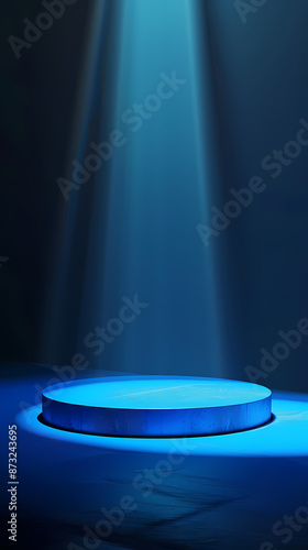 Round podium pedestal in the room with blue light beams