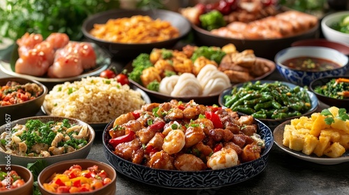 Round table overflowing with an extravagant spread of international dishes, from Asian stir-fry to Italian pastries, vibrant colors and textures, elegant table decor