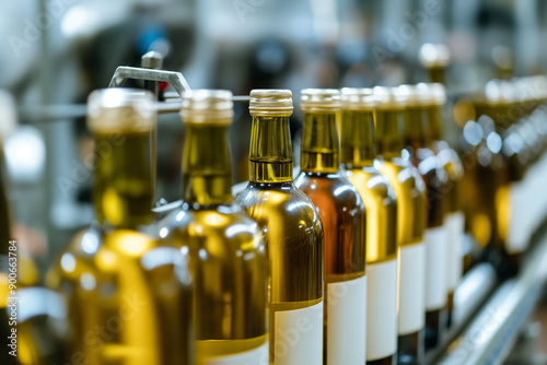 Row of Bottled Beverages on Factory Conveyor Belt in Bottling Plant