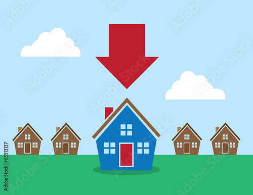 illustration, vector, colours, red, blue, chimney, brown, cloud, grass, home, house, roof, single, sky, suburban, sold, realtor, residential, exterior, view, contemporary, yard, structure, real estate, quaint, family, greeting, card, black, white, pecking, best, new, rent, buy, bought, arrow, pointing, select, decide, decision