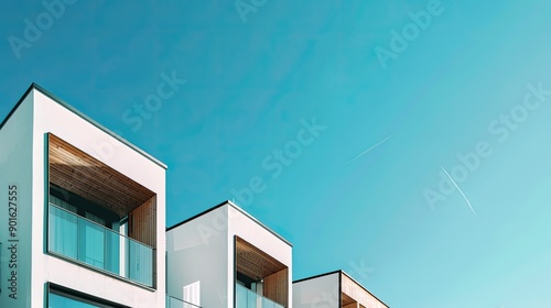 Row of newly finished modern houses under a clear blue sky, with ample background copy space for text or ads