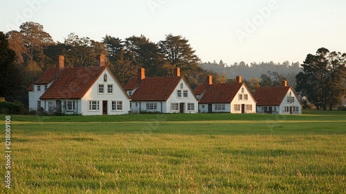 house, white, row, red, tile, roof, green, grass, field, tree, landscape, nature, scenic, rural, countryside, architecture, building, home, dwelling, residential, village, exterior, facades, sunset, sunlight, evening, dawn, sky, clear, calm, peaceful, tranquil, serene, picturesque, charming, quaint, beautiful, lovely, attractive, simple, elegant, traditional, classic