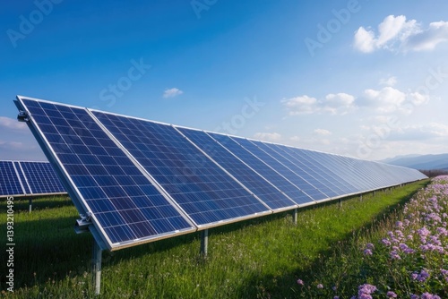 row, solar, panel, glistening, under, sun, while, casting, long, shadow, green, field, foreground, filled, blossoming, wildflower, deep, blue, sky, up high, compelling, background, empty, expanse, abundant, copy space, text, overlay, branding, opportunity, inspiration, creative, sharpened, concept, composition, modern, minimal