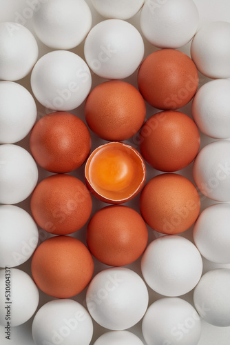 Row of white and brown eggs and single broken egg with a yolk. Mosaic pattern of brown and white whole eggs and cracked brown egg with a yolk. Flat lay