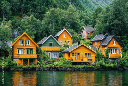 Row of yellow houses on water, reflecting in calm lake, surrounded by lush green trees under clear blue sky, creating serene and picturesque waterfront scene.