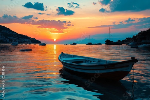 Rowboat floating on the water during sunset