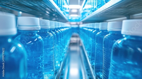 bottle, water, blue, plastic, liquid, refreshment, drink, row, shelf, warehouse, factory, production, industry, manufacturing, supply, cardboard box, container, hydratation, beverage, cool, clean, pure, crisp, transparent, commercial, massa, line, commodity, drinkable, fluid, quench, retail, wholesale, inventory, stock, storage, pallet, cap, cylindrical, business