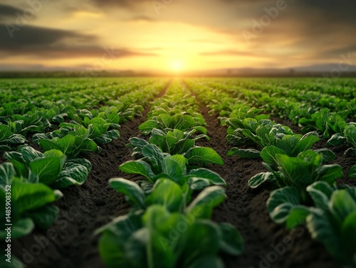 Rows of cabbage with dewdrops at dawn, symmetrical patterns and low-angle light