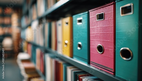 binder, binder, book, book, shelf, shelf, library, office, storage, filing, organisation, colourful, red, pink, yellow, green, blue, turquoise, teal, row, row, stack, stack, paper, document, file, folder, archive, archive, collection, collection, catalog, information, cognition, learning, education, reading, study, research, detail, detail, closeup, perspective, depth, shallow, soft, background, blurred