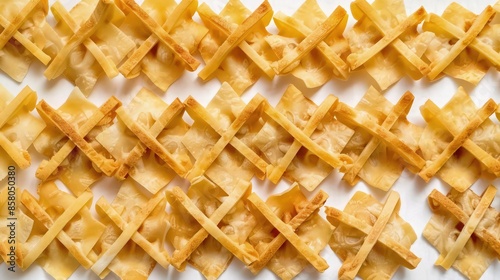 Rows of crispy fried wonton wrappers are arranged in a geometric crisscross pattern suitable for appetizer menus or Asian food advertising templates.