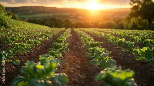 field, farm, agriculture, sunset, sun, row, plant, green, leaf, dirtied, earth, ground, crop, farming, gardening, nature, landscape, rural, countryside, scene, view, background, image, photo, picture, ecology, environment, growth, healthy, vibrant, organic, natural, produce, vegetation, springtime, summer, evening, gold, light, horizon, hill