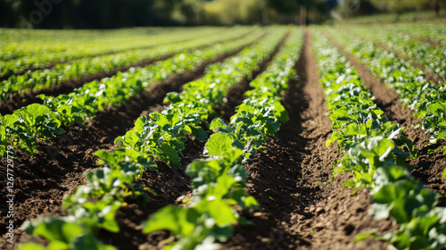 Rows of vibrant green young plants stretching across a cultivated field under bright sunlight symbolizing agricultural abundance and sustainable farming practices