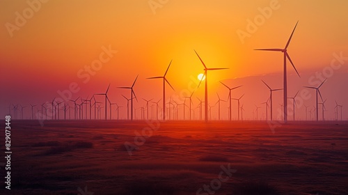 Rows of wind turbines at sunrise, silhouetted against a warm, colorful sky. The image highlights renewable energy, clean power, and the beauty of technology in harmony with nature.