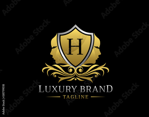Royal Beauty Logo With H Letter. Elegant Gold Shield badge With Beauty Face Shape perfect for salon, spa, cosmetic, Boutique, Jewelry.
