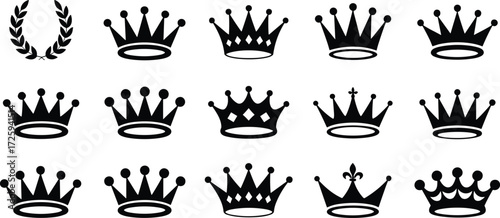 Royal crown icons, black silhouette vector, laurel wreath symbol, heraldic design, monarchy emblem, regal graphic, isolated, minimal, elegant, classic
