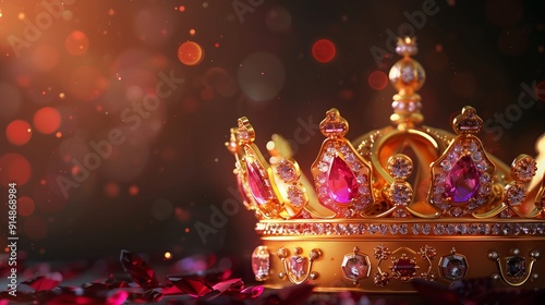 Royal Majesty: A golden crown adorned with rubies rests on a bed of rose petals