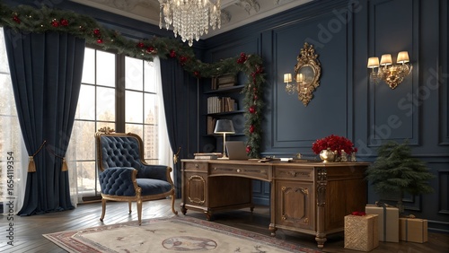 Royal Navy Home Office with Velvet Chair and Festive Garland