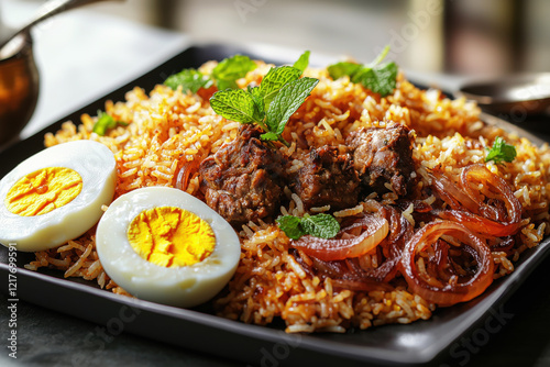 Royal platter of Hyderabadi biryani featuring fragrant rice, tender mutton, onions, and eggs, beautifully garnished