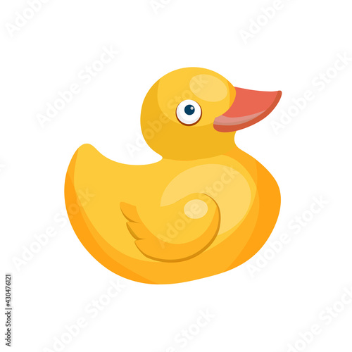 Rubber duck vector flat illustration isolated on white background. Yellow duck toy for children games. Cute little child game for entertainment. Animal or bird icon or symbol design.
