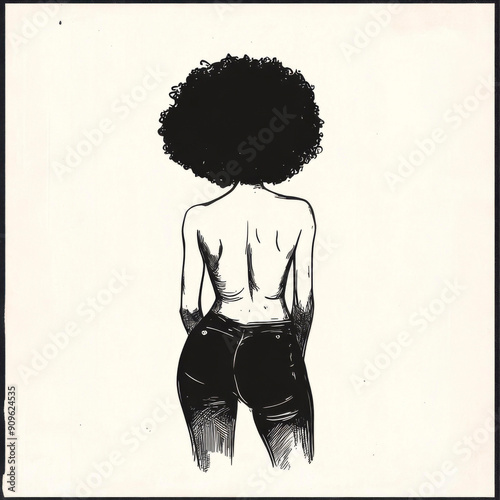 woman, curl, jean, illustration, art, posture, black-and-white, portrait, curve, shape