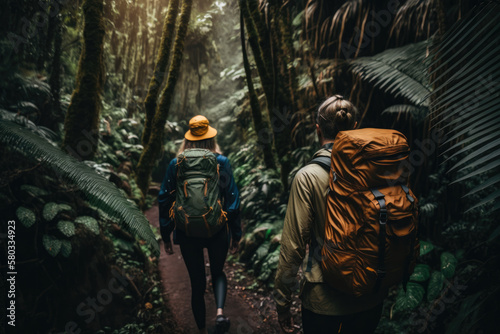 man, woman, backpack, hat, forest, jungle, tree, plant, blue, green, hike, way, vacation, adventure, travel, experience, amazon, rainforest