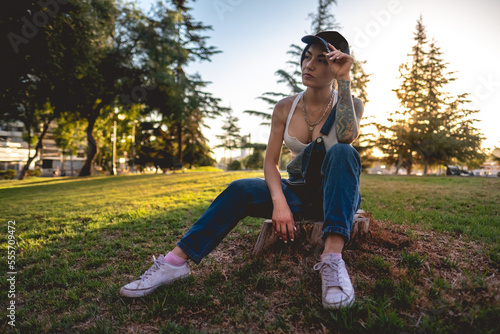 girl, sexy, tattooed, rude, smile, phone, happy, sneaker, seat, copy space, trunk, body, sunset, park, sun, sundown, cap, crop top, background, white top, green, white, caucasian, hispanic, hold, woman, beauty, grass, summer, brunette, spring, fashion, teenage, face, leisure, hair, nature, outside, lifestyle, cute, sitting, jean, teenage, autumn, outdoors
