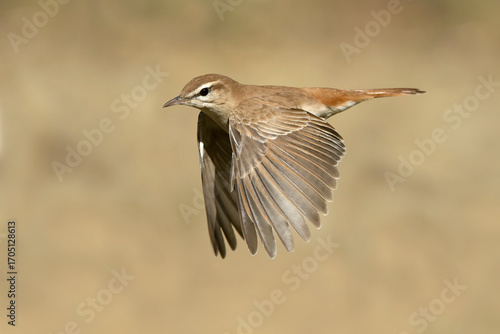 Rufous-tailed scrub robin flying in the last light of a spring day in an olive grove with prickly pears