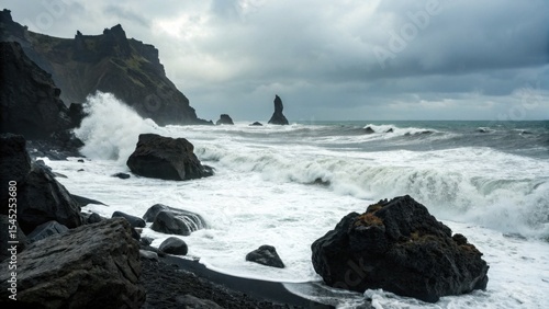 coastline, wave, rock, ocean, storm, dark, cloudy, natural, iceland, beach, sea, shore, cliff, landscape, water, scenery, wild, nature, turbulent, splash, dramatic, coastal, black, geologic, travel, adventure, moody, environment, seacoast, scenic, horizon, beautiful, tranquil, peaceful, texture, atmospheric, sky, shoreline, stormy, marin, calmness, weather, geology, exploration