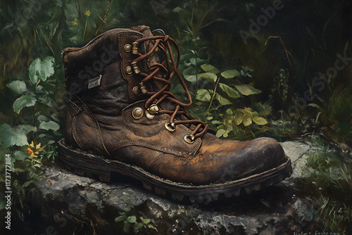 Rugged Hiking Boot Amidst Wilderness Quietude: Embodying Adventure or Seeking Solace in Untamed Realms, New Trail Conquests, Grit meets Nature, Inspiring Soulfulness in Outdoor Journeys.