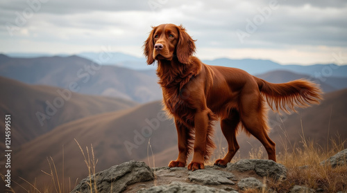 Rugged irish setter stands tall on rocky hillside with flowing red coat