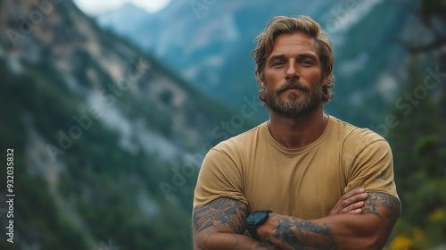 Rugged Outdoorsman with Tattoos Standing Confidently in Mountainous Wilderness