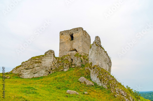sky, rock, grass, headland, castle, fortification, terrain, ruin, hill, mountain, outcrop, landscape, tower, old, architecture, ancient, stone, fortress, mediaeval, fort, ruin, wall, history, travel, europa, historic, landmark, tour tourism, blue