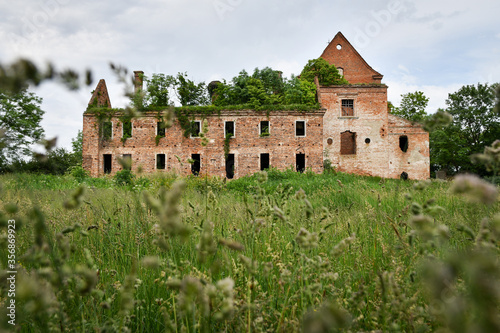Ruins of the ruined catholic cathedral in Kysylyn are overgrown with new green trees. Nature vs History. Selective focus.