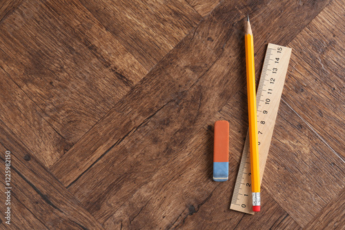 Ruler, pencil and eraser on wooden table, flat lay. Space for text