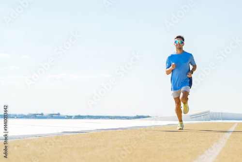 Runner enjoys a sunny day workout along a seaside path in a vibrant blue sky setting