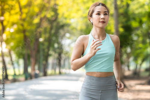 Running Asian woman. Female Runner Jogging during Outdoor Workout in a Park. Asian woman running in garden. Her morning exercise.
