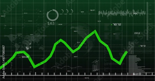 dashboard, green, jagged, grid, gauge, datum, display, interface, futuristic, minimalist, dynamic, white, world map, waveform, histogram, timeline, tick, numeric, label, peak, marker, dot, overlay, chart, financial, market, visualisation, digital, electronic, stylised, centered, thick, bright, contrast, dial, segmented, arc, column