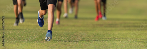 Running children, young athletes run in a kids run race, running on grass detail on legs, running in the light of morning