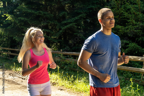 Running fitness couple of runners doing sport on road outdoor. Active living man and woman jogging training cardio in summer outdoors nature.