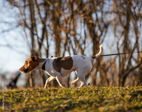 Running Jack Russell terrier on a leash. Jack Russell Terrier strolls through the grass in the park on a leash, selective focus.