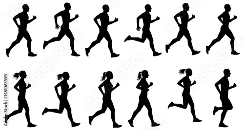 Running men and women, isolated vector silhouettes. Run, side view. Silhouettes of athletic looking male and female runners running. JPEG version.