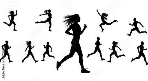 isolated, transparent, running, jumping, people, silhouette, athlete, fitness, exercise, sport, marathon, jogging, sprint, active, healthy, dynamic, motion, male, female, sporty, training, cardio, aerobic, competition, action, black-and-white, illustration, graphic, design, vector, background, silhouette