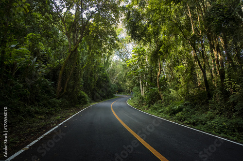 road, forest, nature, asphalt, travel, tree, highway, tree, landscape, green, rural, sky, autumn, way, transportation, country, street, countryside, curve, drive, path, wood, lane, mountain, scenic, mountain road, country road, foliage, tropical, rainforest, tropical climate, scenery, clean, serene, cloudy, rain cloud, roadside, lonely, alone, distant, shrub, bush