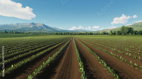 Rural farmland rows, mountain backdrop, sunny day, agriculture